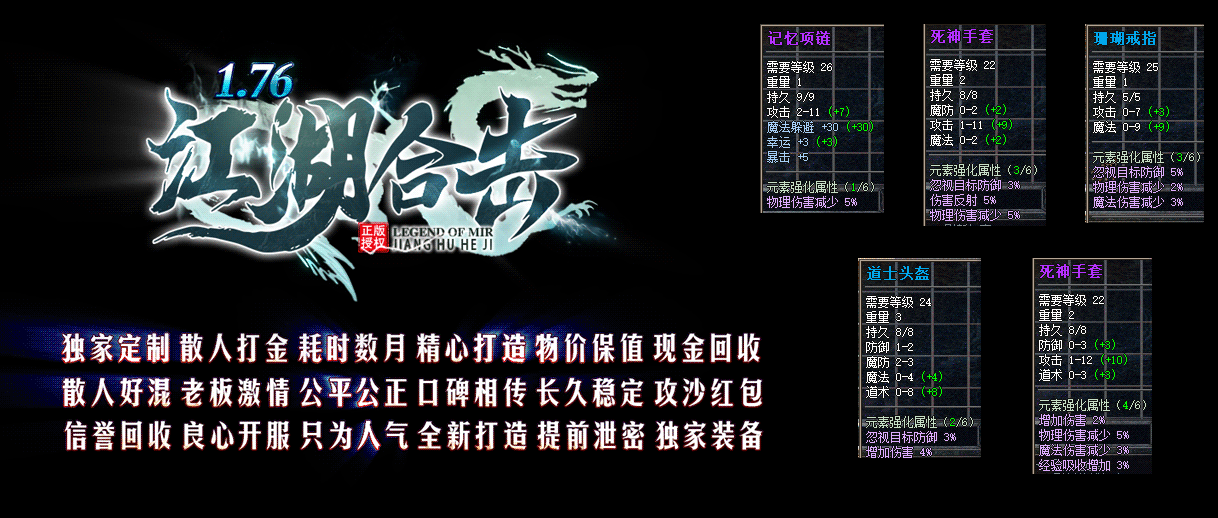 • 【游戏介绍】:176江湖小极品+10元素合击,全网独家,品牌大服,超多特色等您体验!